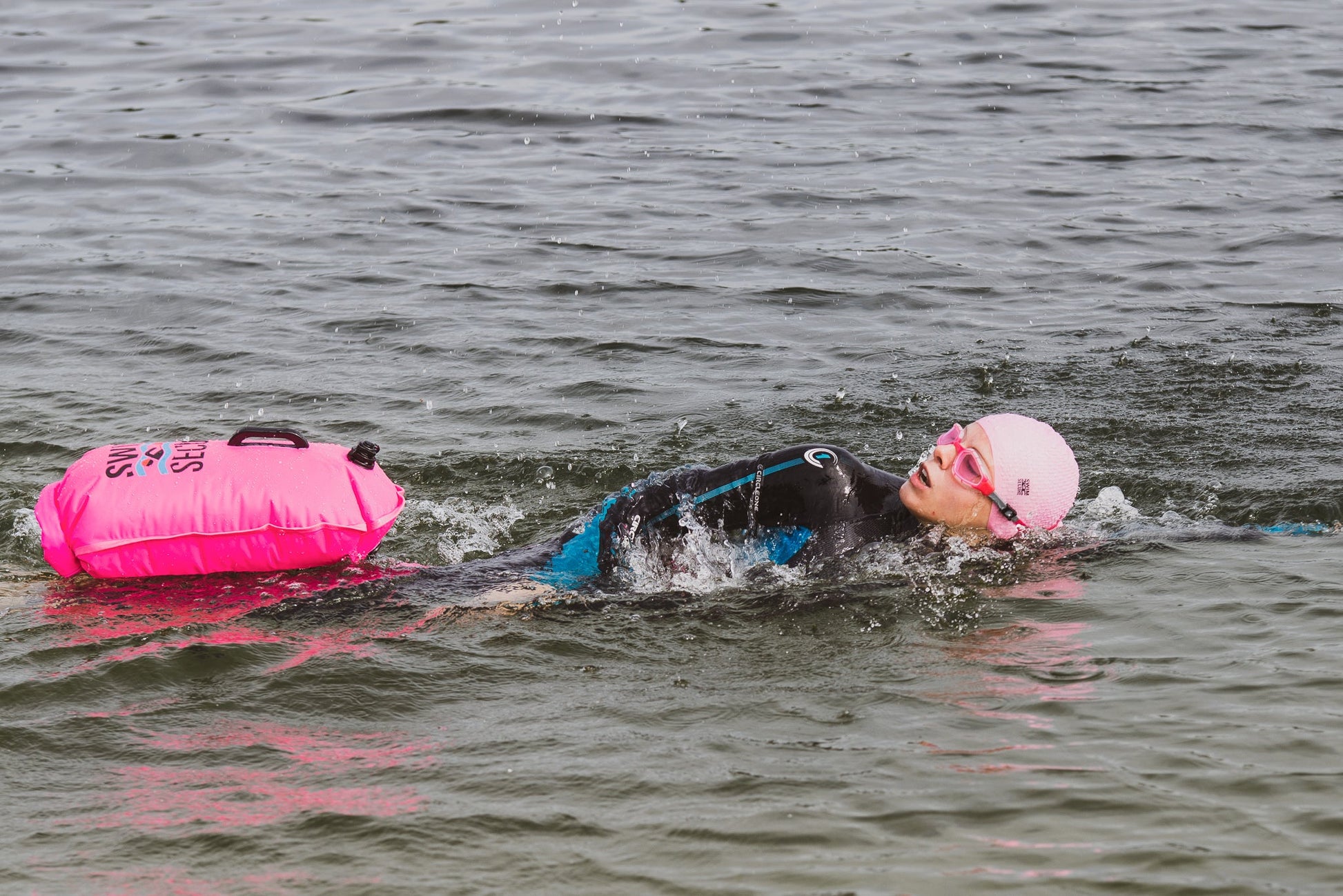 A brightly colored high visibility inflatable dry bag swim buoy with leash and waist belt. Ideal for storing kit whilst you swim and for increased visibility in open water. All our inflatable dry bags will easily support an adult's weight if you need to rest.